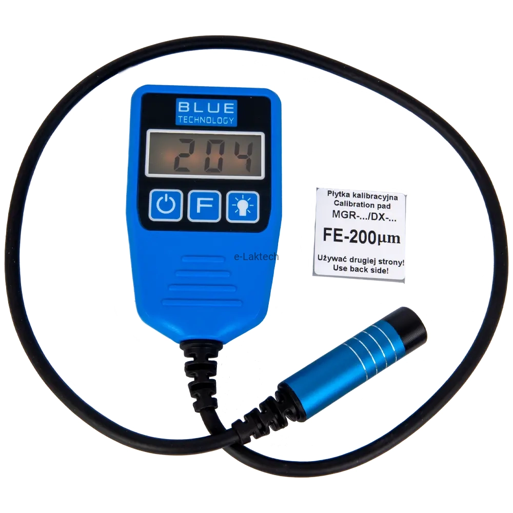 Możesz sprawdzić działanie miernika, przykładając sondę do płytki „FE-200um”, gdzie wynik powinien wynosić 200 µm +/- 10 µm.