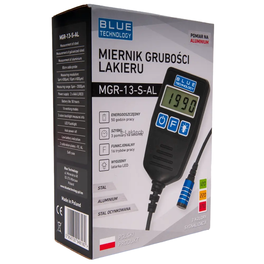 MGR-13-S-AL to zaawansowany miernik lakieru, który umożliwia precyzyjny pomiar grubości powłok na różnych powierzchniach metalowych: stali, stali ocynkowanej oraz aluminium. Urządzenie automatycznie rozpoznaje rodzaj podłoża, wyświetlając symbol „FE” dla stali oraz „AL” dla aluminium.