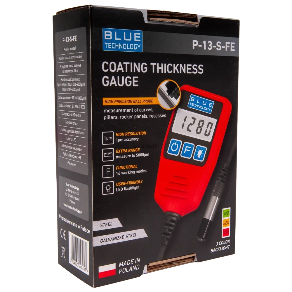 Miernik wyposażony jest w duży, podświetlany ekran LCD, który prezentuje wyniki w czytelny sposób, z trzema kolorami wskazującymi na różne warstwy lakieru i obecność szpachli. Urządzenie wyróżnia się szerokim zakresem pomiarowym (0 ~ 5000 μm) i wysoką dokładnością, zapewniając rzetelne wyniki.