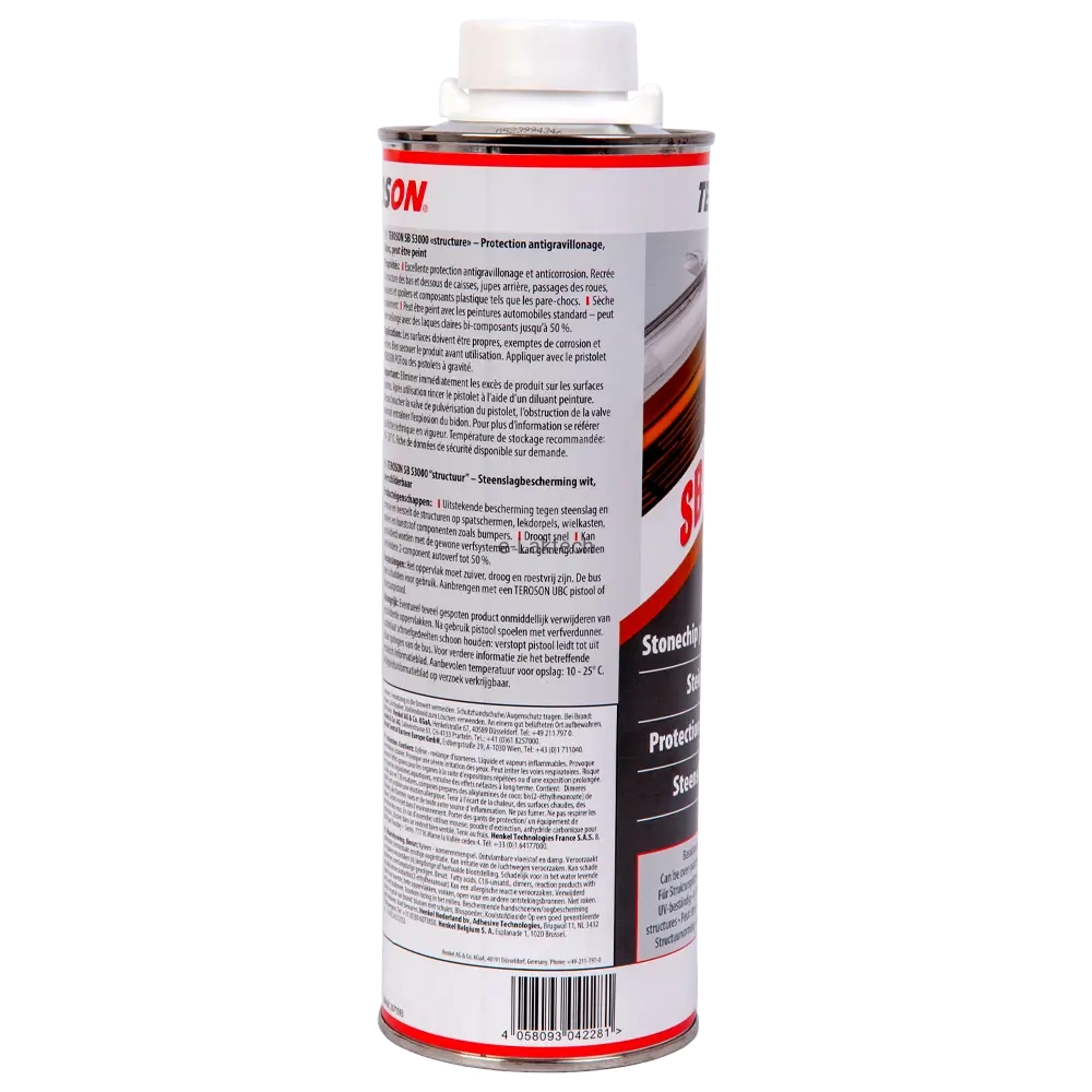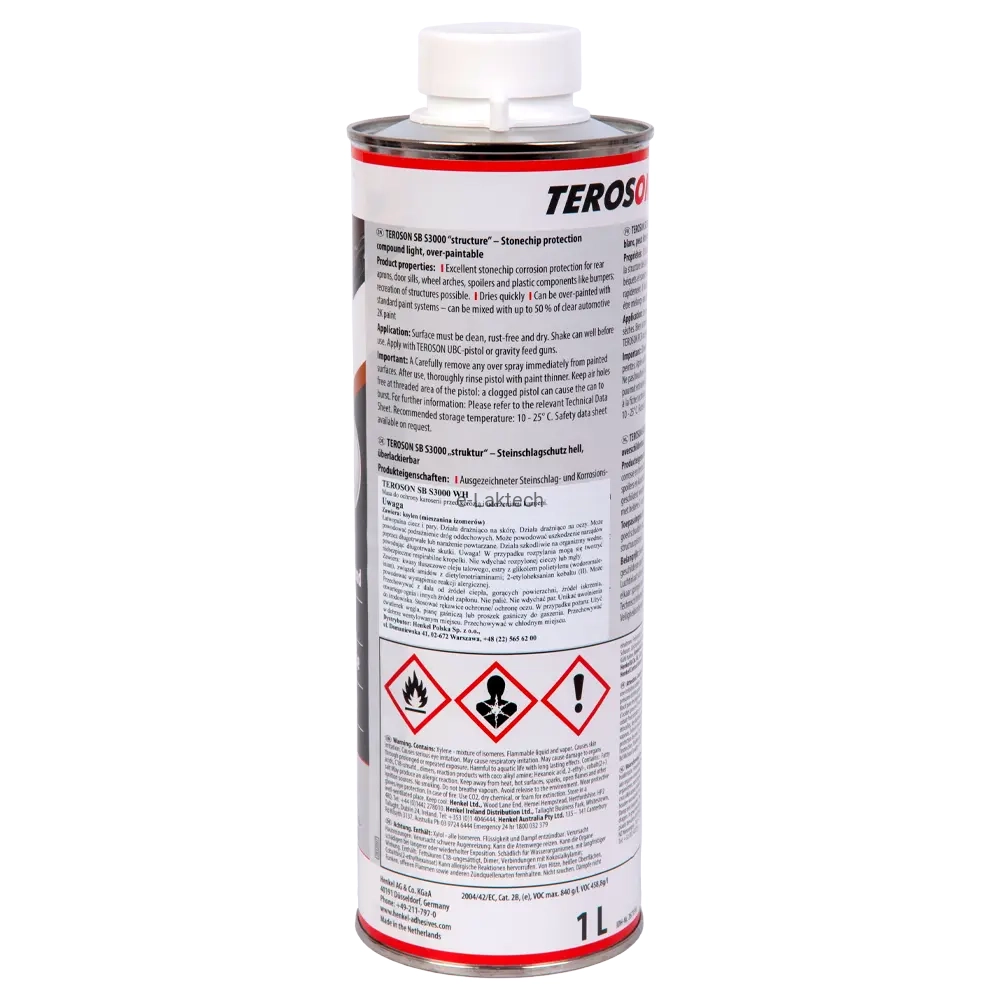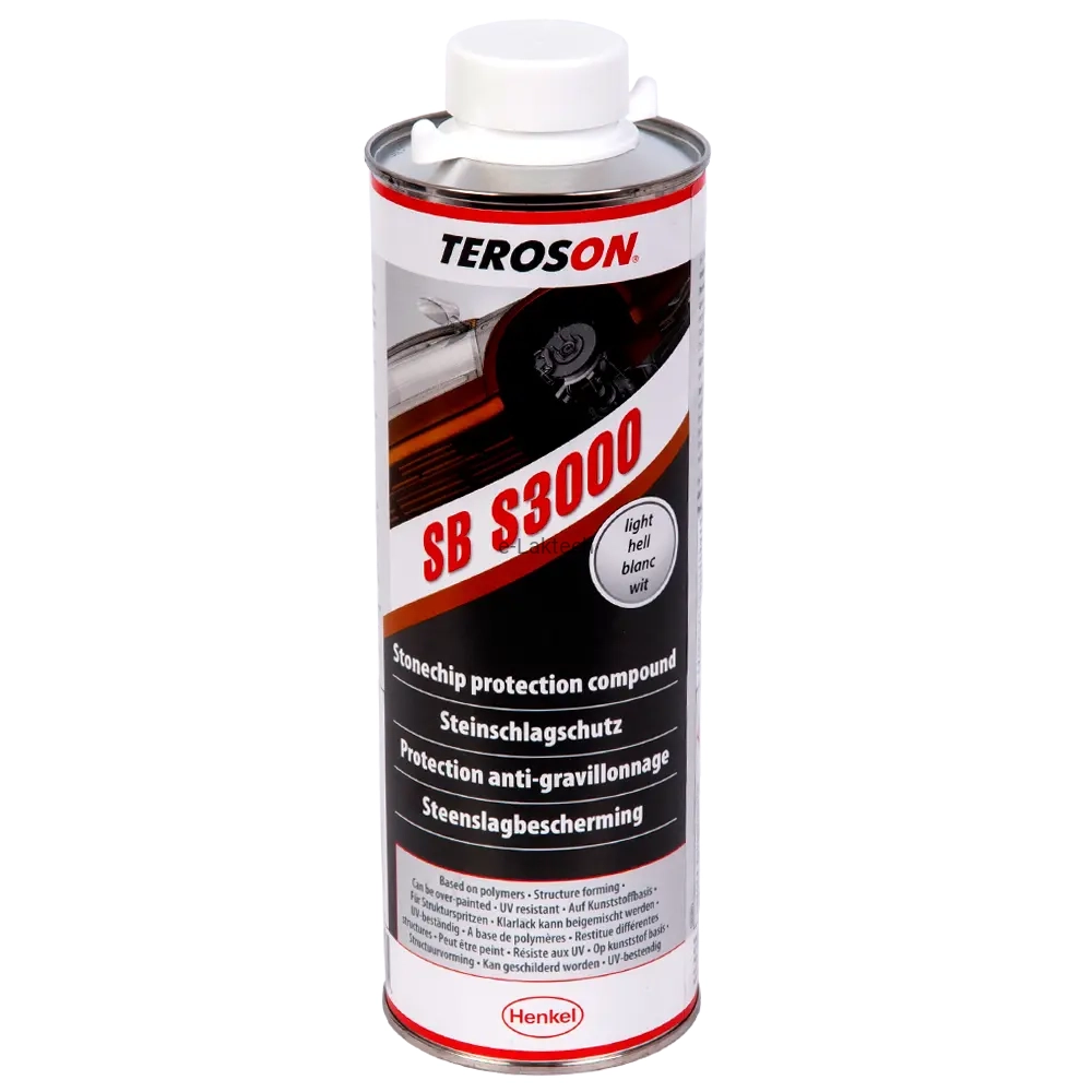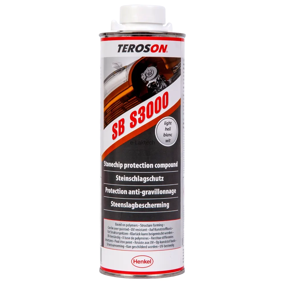 TEROSON SB S3000 to wysokiej jakości powłoka antyodpryskowa na bazie żywicy syntetycznej, przeznaczona do ochrony karoserii pojazdów przed uszkodzeniami spowodowanymi przez uderzenia kamieni. Produkt doskonale sprawdza się przy naprawach punktowych i umożliwia odtwarzanie różnych oryginalnych tekstur, takich jak te występujące na zderzakach, progach, panelach bocznych i podwoziu pojazdów.