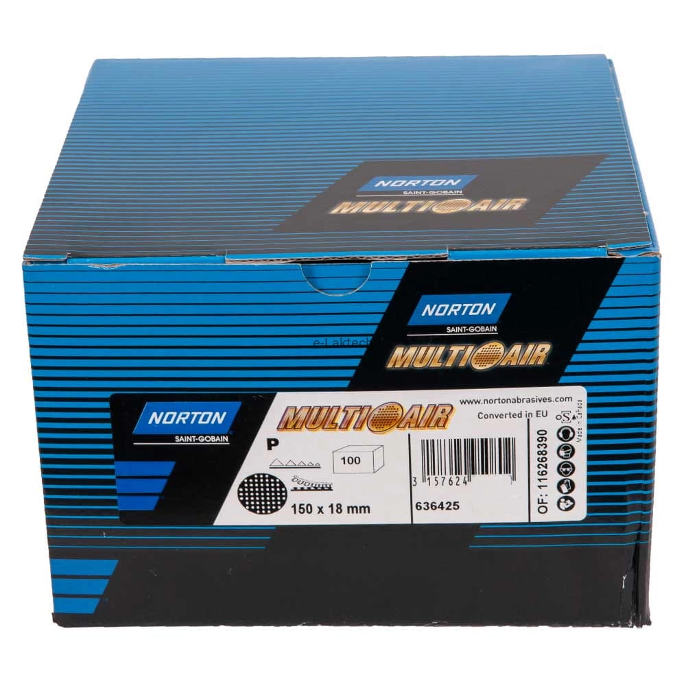 Materiał szlifierski Norton Multi -Air® wytwarzany jest przy zachowaniu najwyższych standardów technologicznych. Został specjalnie zaprojektowany do końcowych operacji szlifowania na sucho. Krążek ten, szlifuje szybciej, chłodniej, jest bardziej odporny na zabijanie i ma dłuższą żywotność niż inne konwencjonalne papiery. Specjalna powłoka No-Fil® zapobiega gromadzeniu się kurzu i przedwczesnemu zapychaniu się krążka. Drobne ziarno, może być użyte do końcowych operacji szlifowania na sucho przed lakierowaniem.