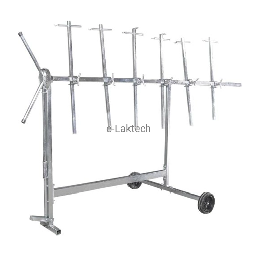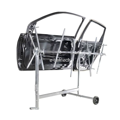 System obrotowy sterowany pedałem umożliwia obracanie elementów o 360 stopni i ustawianie ich w różnych najdogodniejszych pozycjach zęby na kole blokującym w kształcie trapezu stojak wyposażony jest w dwa koła, których bieżnia pokryta jest gumą odporną na działanie rozpuszczalnika stojak posiada 6 sztuk ramion z potrójnym systemem zamocowań oraz przedłużkę całość konstrukcji stojaka jest ocynkowana galwanicznie