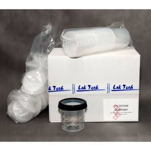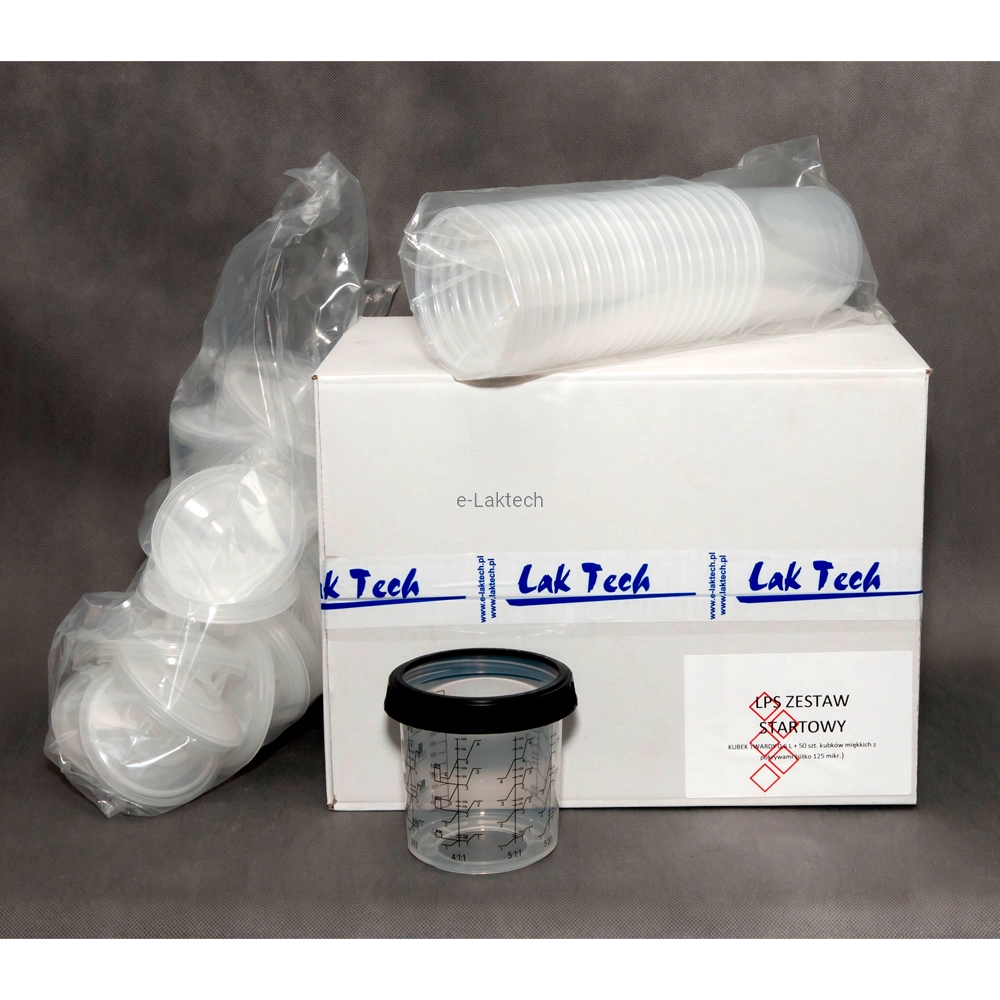 Pakiet kubków LPS i pokrywki z sitkami najczęściej stosowanych w warsztatach lakierniczych. Kubki miękkie jednorazowe.