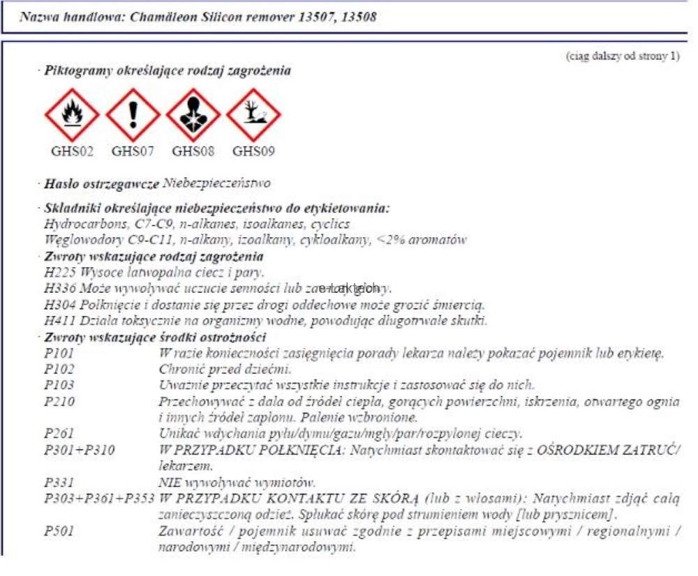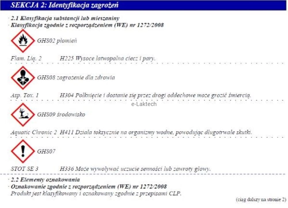 - EUH066 Powtarzające się narażenie może powodować wysuszanie lub pękanie skóry.