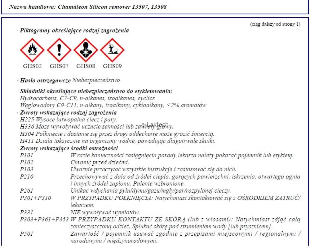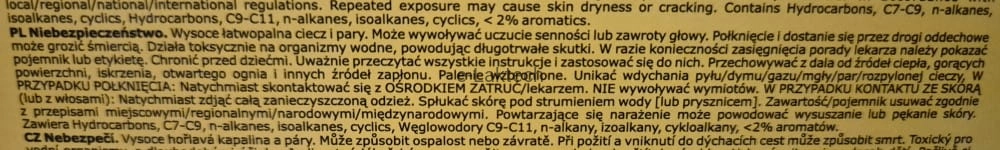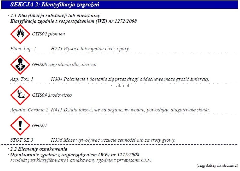 - EUH066 Powtarzające się narażenie może powodować wysuszanie lub pękanie skóry.